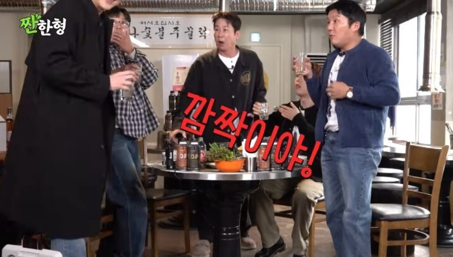 신동엽은 놀란 듯 자리에서 일어나며 “깜짝이야”라고 외쳤습니다.