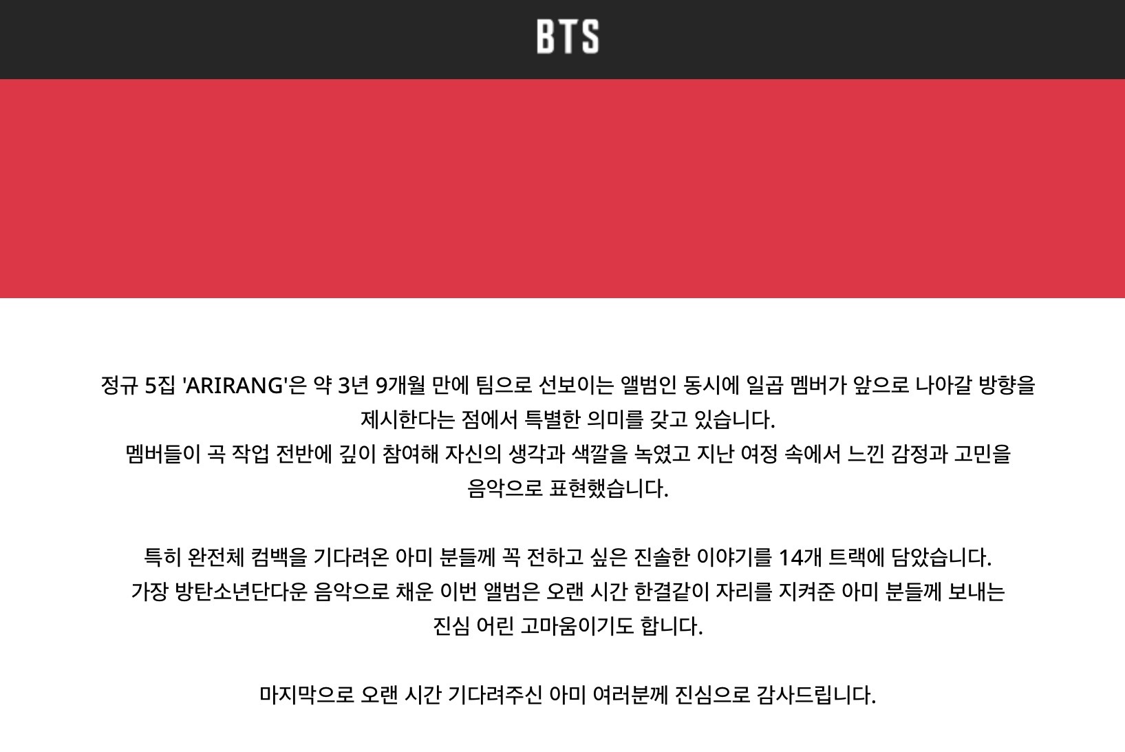 정규 5집 **‘ARIRANG’**을 발표한다.