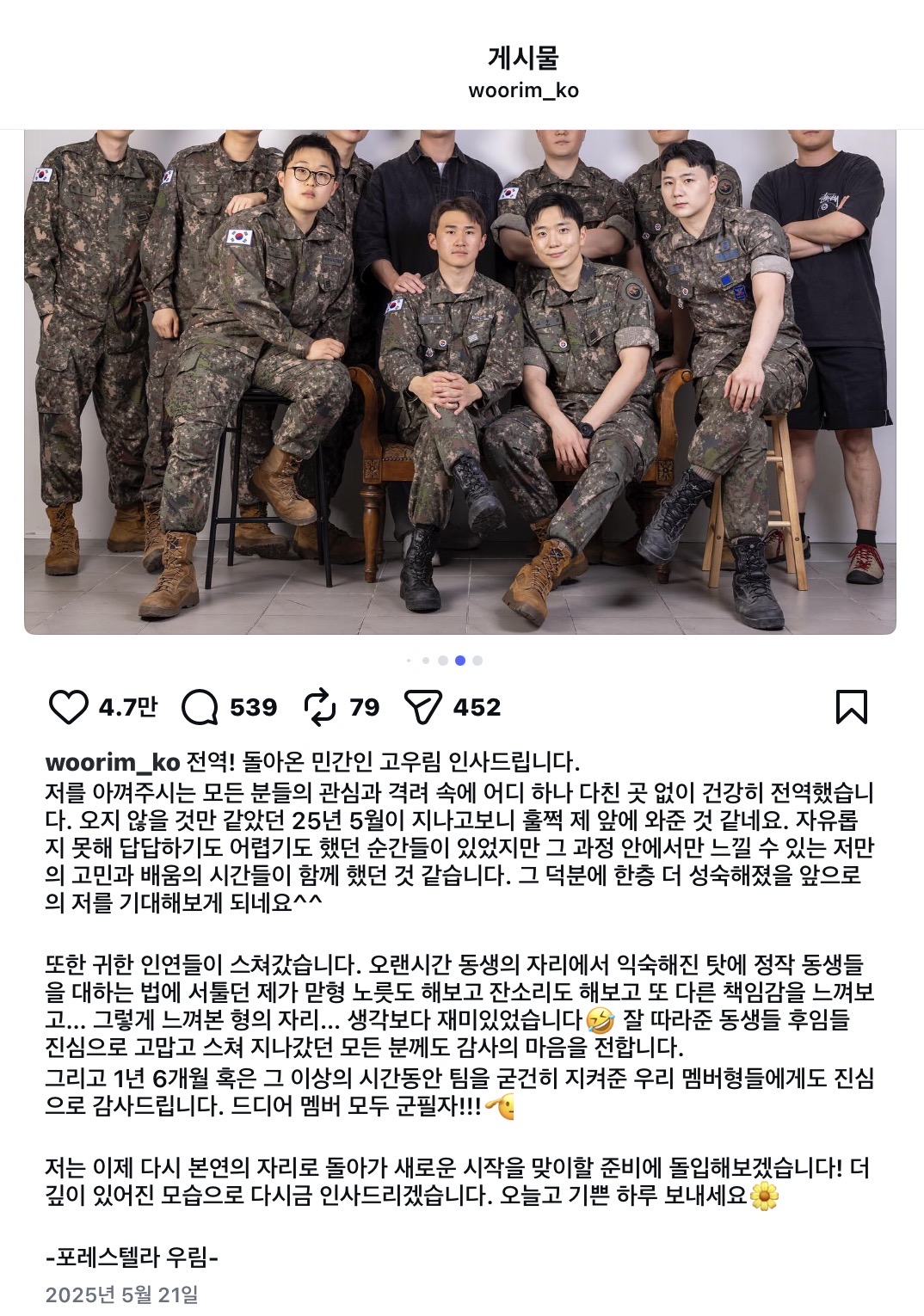 - 남편 고우림 전역 후 약 6개월 경과
