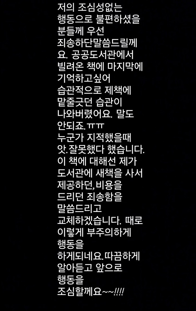 무엇보다 중요한 점은 잘못을 인정하고 책임을 약속했다는 것이다. 공공재를 대하는 태도는 곧 시민의식과 직결된다. 우리 역시 도서관 책을 펼칠 때, 그 책이 수많은 사람의 손을 거쳐 온 공동 자산임을 잊지 말아야 할 것이다.