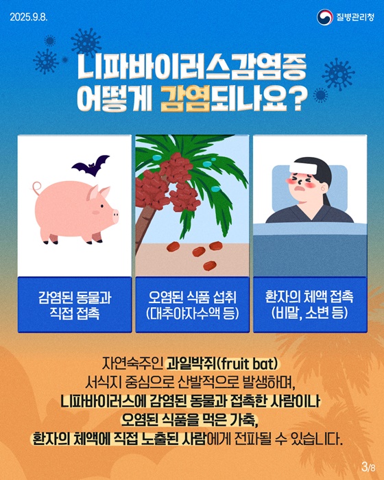니파바이러스(Nipah virus)는 과일박쥐(fruit bat)를 자연숙주로 하는 바이러스로, 사람과 동물 모두에게 감염될 수 있습니다.