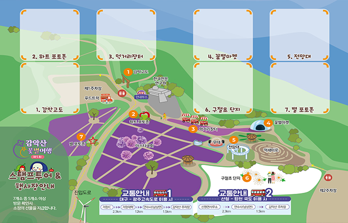 - 감악고도,하트포토존,먹거리장터,꽃별마켓,전망대,구절초단지,별포토존 등 다양한 장소 관람