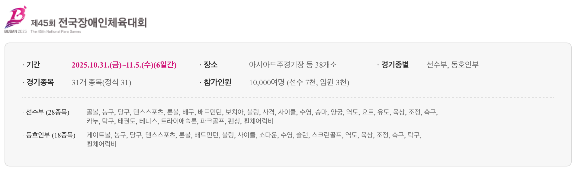 - 관광 인프라: 해운대, 광안리, 자갈치시장 등과 연계한 관광형 체전